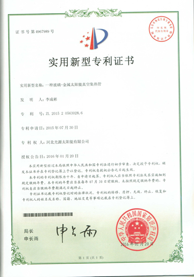 實(shí)用新型專利證書--一種太陽(yáng)能真空集熱管
