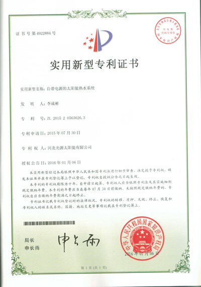 實(shí)用新型專利證書--自帶電源的太陽(yáng)能熱水系統(tǒng)