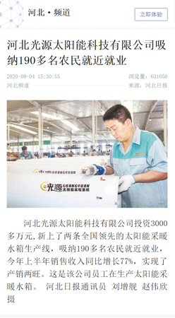 新華社報(bào)道說:“河北光源太陽能科技有限公司投資3000多萬元,新上了兩條全國領(lǐng)先的太陽能采暖水箱生產(chǎn)線,吸納190多名農(nóng)民就近就業(yè),今年上半年銷售收入同比增長77%,實(shí)現(xiàn)了產(chǎn)銷兩旺。”