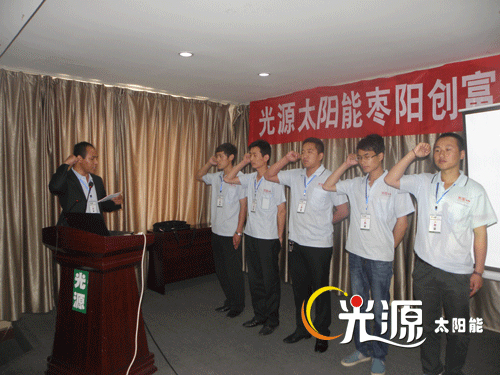 會議中湖北區(qū)域經理劉進輝帶領團隊進行的宣誓儀式,充分展現了光源太陽能有限公司的員工風貌及企業(yè)精神。利用新能源,保護美好家園,傳承正能量,將會議推進高潮。