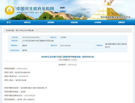 喜報(bào)頻傳,河北光源太陽能科技有限公司,在2019年09月16日,2019年王官莊鎮(zhèn)氣代煤工程壁掛爐采購及安裝項(xiàng)目的競標(biāo)中,憑借過硬的產(chǎn)品質(zhì)量,扎實(shí)高效的工作作風(fēng),卓越的運(yùn)作團(tuán)隊(duì)和良好的企業(yè)信譽(yù),以絕對(duì)的優(yōu)勢順利中標(biāo)。