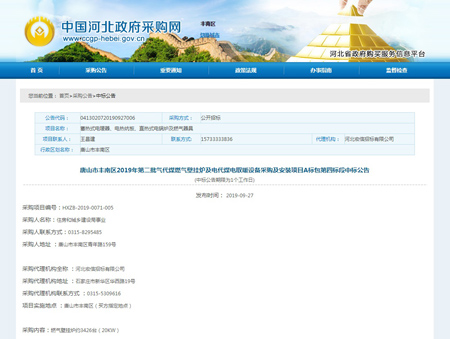 奮力拼搏創(chuàng)佳績,捷報頻傳奏凱歌。河北光源太陽能科技有限公司,在2019年09月27日,唐山市豐南區(qū)2019年第二批氣代煤燃?xì)獗趻鞝t及電代煤電取暖設(shè)備采購及安裝項目A標(biāo)包第四標(biāo)段中標(biāo),為我公司2019年度輝煌的經(jīng)營業(yè)績再添濃墨重彩的一筆。