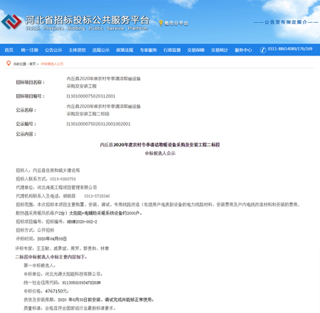 在抗疫的關鍵時期,復工復產正在如火如荼的進行,沒有什么能比一份中標通知書更能振奮人心了。在營銷工作舉步艱難的特殊時期,河北光源太陽能科技有限公司,中標內丘縣2020年度農村冬季清潔取暖設備采購及安裝工程,為我公司2020年度輝煌的經營業績再添濃墨重彩的一筆。